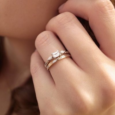 もうひとつ、婚約指輪のリングサイズは指輪のフィット感を左右する重要な要素です。でも、大丈夫。ほとんどの本物の婚約指輪は贈った後にサイズ加工ができるのです。もし少しでもフィットした婚約指輪を贈ってあげたいと思うなら、彼女の指のサイズを確認するために、彼女が普段使用している指輪を借りてきて、サイズを計測する方法も有効です。その場合はその指輪をどの指に着けているかを確認してください。どんなデザインの婚約指輪も即日対応でそろいます