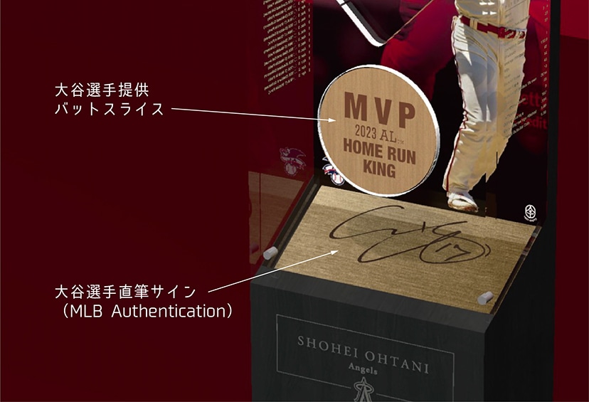 重厚感あふれる専用ケースには大谷翔平選手本人より提供されたバットスライスと、LB公式認証者が全て立ち合い、本当にサインされたものである事が認証された大谷翔平選手直筆のサインが記されております。