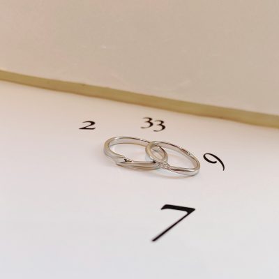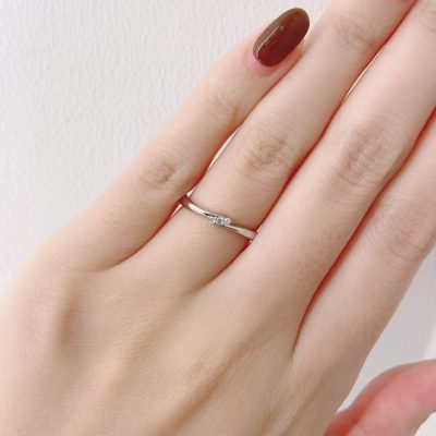 レディースは、ダイヤモンドを優しく包み込むように、センターに斜めにラインが入っています。メンズはつや消し仕上げがメインで、斜めのラインをつなぐ部分だけグロス仕上げになっている、個性的で他にはないデザインです。運命数9のnueveで、おふたりのあたたかな思いやりの心を包み込んで。 - (左)
