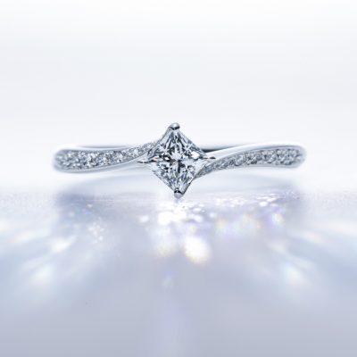 - プリンセスカットのエンゲージリング、縦留のプリンセスカットは非常に珍しいデザインでなかなか人と被らないオンリーワンとなります。