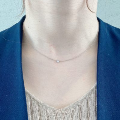 手作業で丁寧に磨き上げられた一石のダイヤモンドが中央で美しい輝きを放つ、繊細で洗練されたプラチナのチェーンペンダントです。