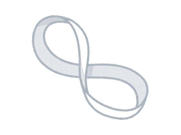 三回ひねりのメビウスの輪は本当はどこかで表と裏が繋がる部分が出てきます。絵には描けるけれども実際に造形する事はできません!三回ひねりのメビウスは「表裏一体」のシンボル…。