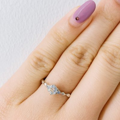 細身のリングでひし形のデザインがあり、可愛らしい印象のエンゲージリング。重ね付けもおすすめです!