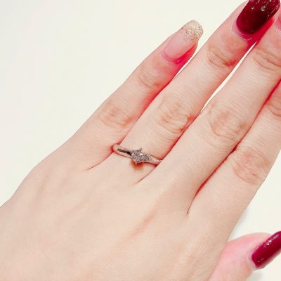 シンプルなダイヤモンド1石と太めデザインのエンゲージリング。女性に人気のウェーブデザインで少し変化を。