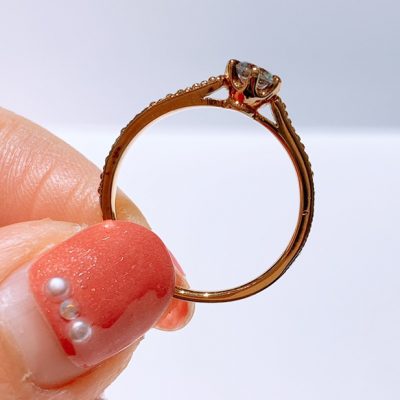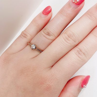シンプルなダイヤモンド一石ですが、リングの部分にミル打ちが施されていてオシャレなエンゲージリングとなっております。
