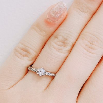 トップのダイヤモンドの両サイドには、リングのラインに合わせてメレダイヤモンドがたくさんセッティングされていて華やかな印象のエンゲージリングです。