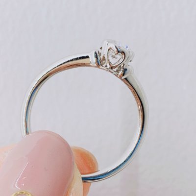 シンプル1石V字デザインです。正面から見るとシンプルですが横からはハートが見えてとても可愛らしい印象のエンゲージリングです。