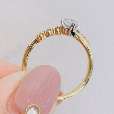イエローゴールドとプラチナの2色コンビデザイン。メイン色はイエローゴールドです。トップのダイヤモンドの両サイドにはメレダイヤモンドが3石ずつセッティングされています。