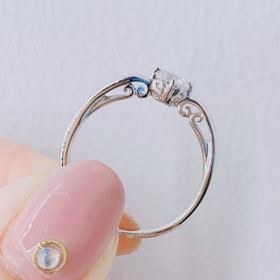 正面から見るとシンプル1石ストレートデザインですが、横から見ると天使の羽の形をした枠になっています。