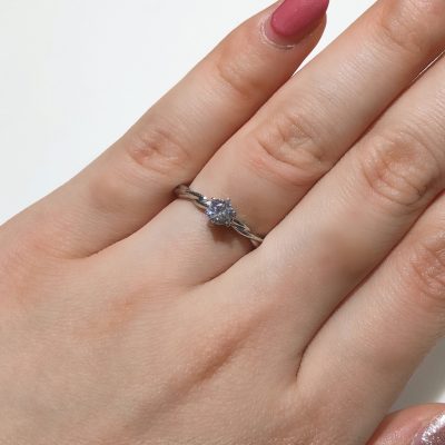 シンプルな1石のダイヤモンドがセッティングされたエンゲージリング。サイドがひねりウェーブラインになっていて、可愛らしい印象のデザインです。