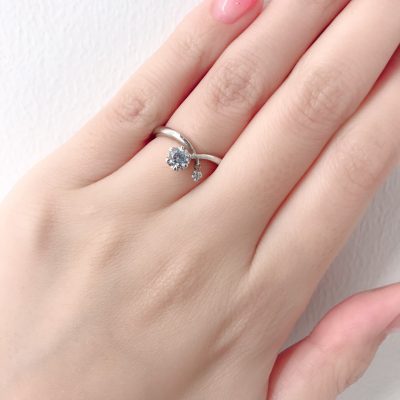 メインダイヤモンドを雫のようにセッティングした個性的なデザイン。