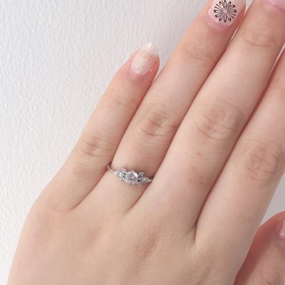 両サイドにマーキスカットのメレダイヤが1石ずつセッティングされています。凛と咲き誇るお花のようなデザインです。