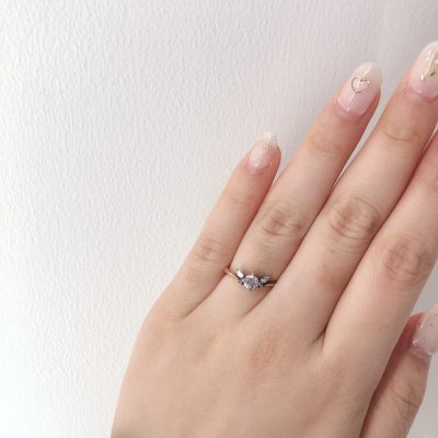 まるで蝶の羽のようにセッティングされたマーキスカットのダイヤが可愛らしいエンゲージリング。V字のラインは女性の指をすっきり美しく魅せてくれます。