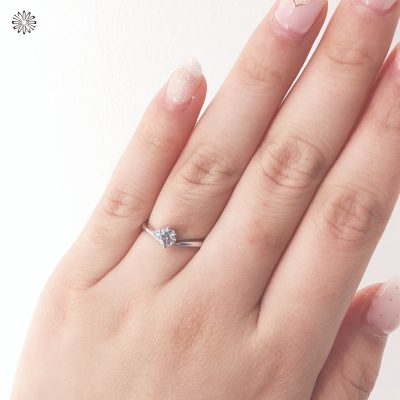 センターダイヤの片側にメレダイヤが1石セッティングされた、シンプルなデザイン。V字ラインが指をすっきり美しく魅せてくれます。