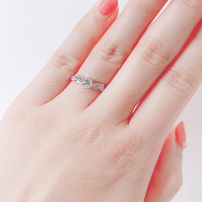 可愛らしい立体的なリボンの形をしたエンゲージリング。リボンのラインに合わせてメレのダイヤモンドがセッティングされているので、可愛らしさと華やかな印象のデザインとなっております。