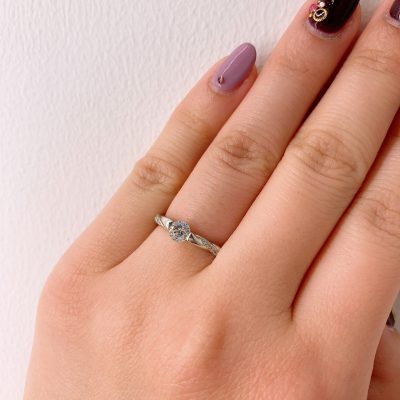 シンプル1石ひねりデザインのエンゲージリング。ひねりのラインに合わせてメレダイヤモンドがセッティングされています。