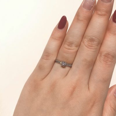 センターダイヤモンド1石と、両サイドに7石ずつメレダイヤをセッティングしたエンゲージリング。ゴージャスな雰囲気で、華やかなデザインがお好みの方にオススメです!