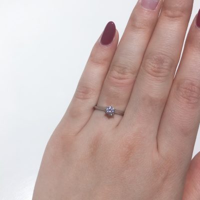 1石のダイヤモンドを6本の爪で留めた、6点留めのシンプルなデザイン。爪の間から光を受け、ダイヤモンドがより美しく輝きます。