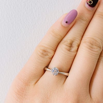 シンプル1石デザインですが、ダイヤモンドを留めている枠がフラワーの形をしているので、さりげなく可愛らしいエンゲージリングです。