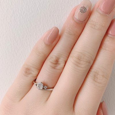 センターのダイヤモンドのサイドにはメレダイヤが1石セッティングされています。リングが木の枝に見えてダイヤモンドは美しく咲いている花のようにも見えます。