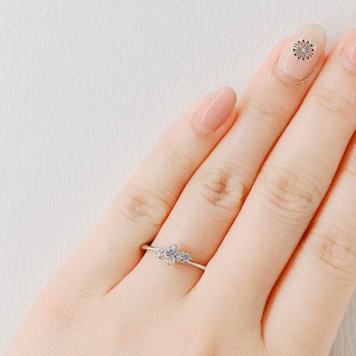 細身のウェーブデザイン。トップのダイヤモンドの両サイドにはメレダイヤが2石、斜めにセッティングされていて可愛らしい雰囲気のエンゲージリングです。