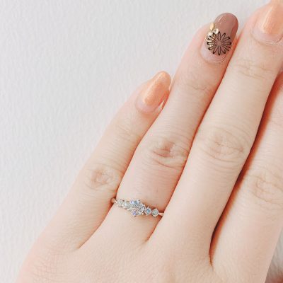 トップのダイヤモンドの両サイドにメレダイヤが2石ずつセッティングされています。華やかで可愛らしいエンゲージリングです。