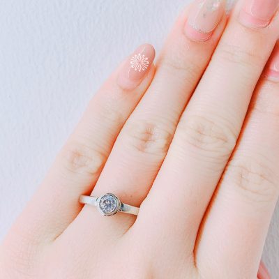 シンプルなダイヤモンド1石デザイン。ダイヤモンド埋め込みタイプでラウンド型がキレイに見えます。