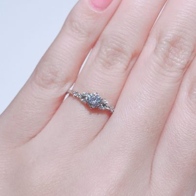 両サイドにセッティングされたメレダイヤモンドが華やかでかわいいデザイン。