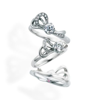優しく、くすり指に巻かれた〝ダイヤモンドの結び目〟がふたりを繋ぐ。 - 裏面に輝く貴石
