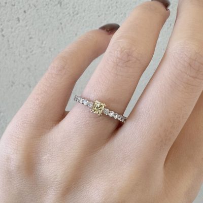 イエローダイヤモンドの両サイドに並ぶダイヤモンドは高品質のアフリカ産の天然ダイヤモンドで揃えています。センターに使用したイエローダイヤモンドは、輝度が高く、明度・彩度ともに高いパフォーマンスを示し、その激しい色合いは多くの人を魅了します。