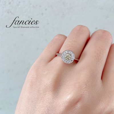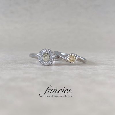 こちらの婚約指輪は、FLY(ファンシーライトイエロー)カラーダイヤモンドがより引き立つようにしたヘイローデザインです。