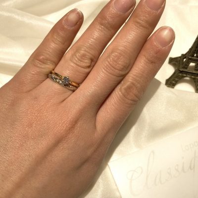 - エンゲージリング:流れのある曲線使いが上品に。4つ爪がシンプルでサイドのダイヤがさり気ない。リングの空間とプラチナ・ピンクゴールドのバランスが絶妙。
