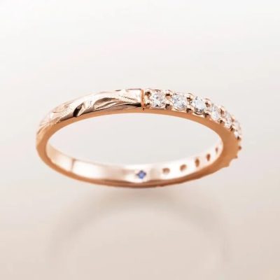 - 繊細な手彫りと0.26ct相当のダイヤモンドが華やかに輝く、エレガントなハーフエタニティリングです。ピンクゴールド素材を使用し、温かみのある色合いが、ダイヤモンドの煌めきを一層引き立てます。シンプルでありながら、華やかで上品な印象を与えるデザインです。