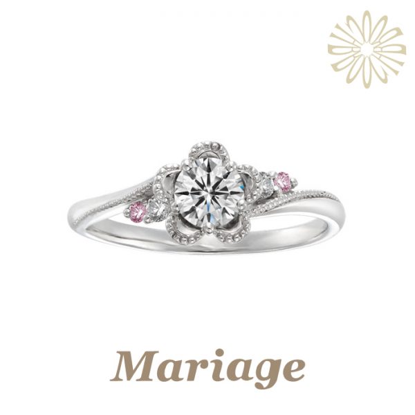 仏語で「高潔」。婚約指輪は梅の花がモチーフ。早春の肌寒い季節に凛とした佇まいで、春の訪れを知らせる梅の花。ほころぶ蕾とともに新しい季節をつれてくるように…これから先のあたたかで豊かな日々を連想させてくれます。