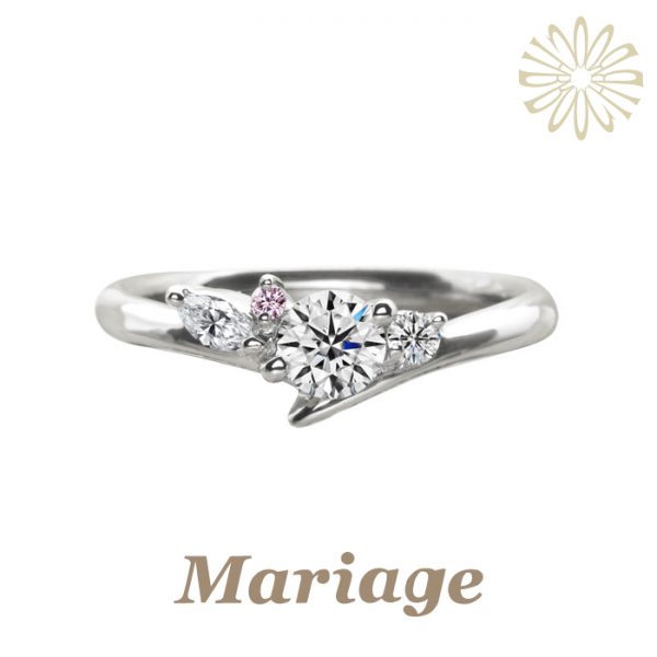 仏語「喜び」の意。愛し合う喜びを花束のように。大切に抱えてあなたに贈りたい…。同シリーズの指輪は、それぞれ花をデザインモチーフにしています。婚約指輪はカラーの花。花言葉は「華麗なる美」「乙女のしとやかさ」「清浄」。花と言葉のもつイメージをもとにして、凛としながらもかわいらしい人を表しています。