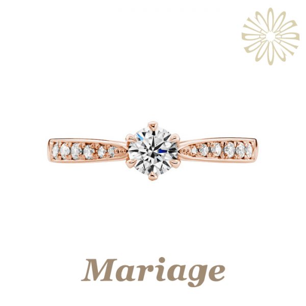 仏語で「清純」の意。純粋さと清らかさをシンプルなデザインでイメージ。王道のストレートなラインが、センターダイヤの美しさをしっかりと受け止めます。真っすぐに向き合うふたりの愛が永遠に輝きますように。