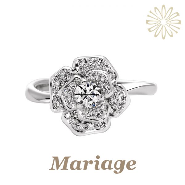 - 仏語で「情熱の薔薇」。情熱の薔薇をモチーフにデザインされたエンゲージリング。花びらに敷き詰められたダイヤモンドが、愛の証であるセンターダイヤモンドをより一層輝かせます。