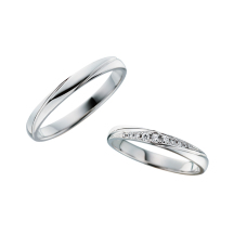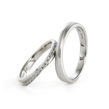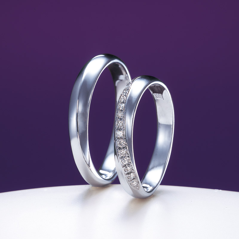 エレガントなリング。リングに対して斜めにダイアモンドが入っているのでギラギラし過ぎず、普段着けしたいがダイアモンドの華やかさも手に入れたい方にはコレ。メンズもレディースのダイヤモンドのシルエットと同じくラインが入っているので、男性にもカッコ良く着けていただけます。