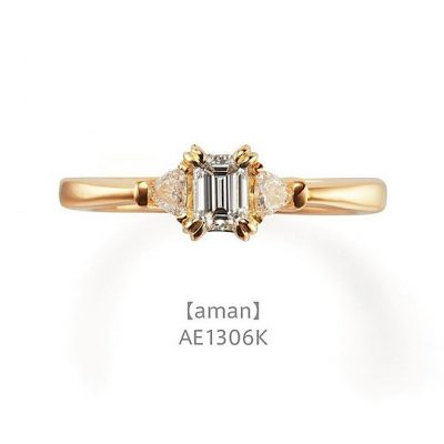 エメラルドカットダイヤと両サイドにセッティングした三角形のトリリアントカットダイヤが高級感を醸し出す華やかな婚約指輪。