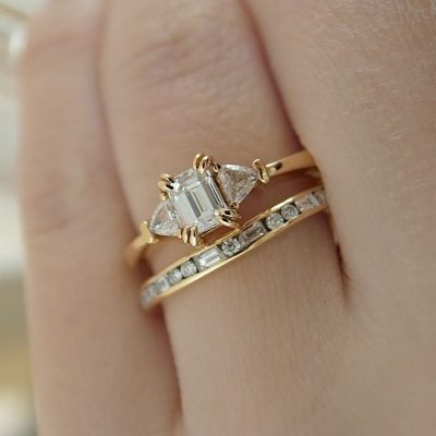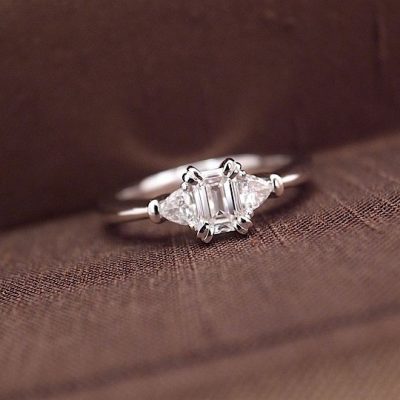四角いエメラルドカットのダイヤモンドと三角形のトリリアントカットダイヤモンドがセッティングされた贅沢な婚約指輪です。