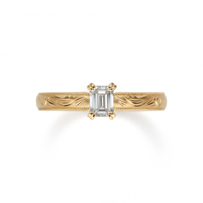 「幸福が飛んでくる」と言われている花言葉の意味を持つ胡蝶蘭がモチーフに描かれている指輪はエメラルドカットダイヤを縦留めにし彫りの描く図柄と融合されたクラシカルで上品なデザインの婚約指輪。