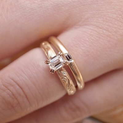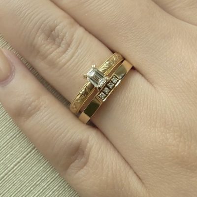 他とは被らないオシャレな彫デザインの特別感のある婚約指輪です。