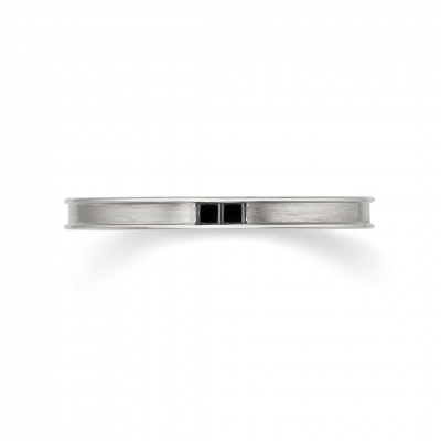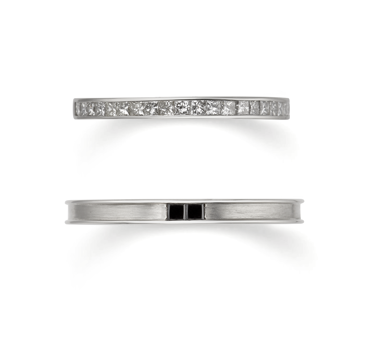 スタイリッシュな艶消しが魅力の結婚指輪。プリンセスカットのブラックダイヤで深い輝きを演出した結婚指輪。