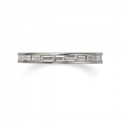 - バゲットカットダイヤが豪華に並ぶエタニティタイプの結婚指輪。ひと目で透明な輝きの虜に。