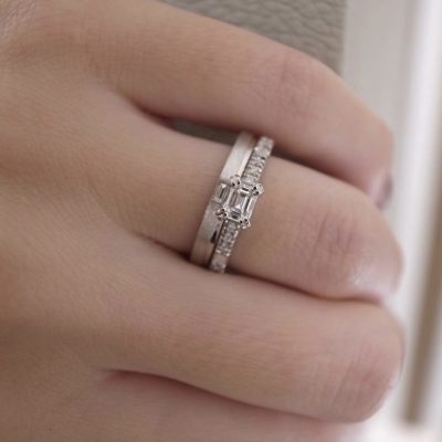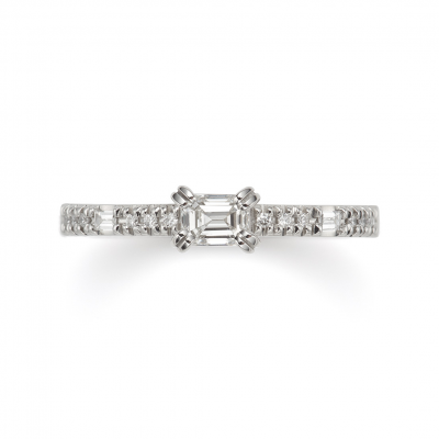 - 3つの異なるダイヤモンドの輝きが楽しめる華やかな婚約指輪。エメラルドカットダイヤを横向きにセッティングし普段使いしやすくカジュアルさを演出。