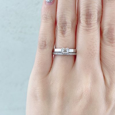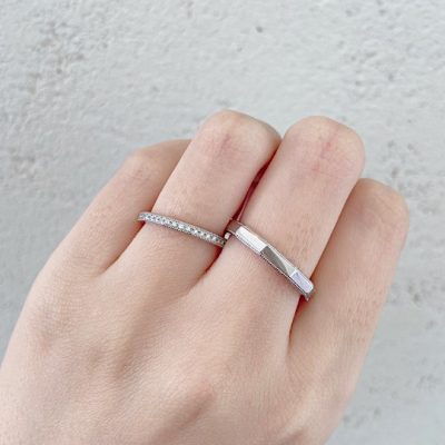 ハーフエタニティタイプの結婚指輪はエレガントな雰囲気になりがちですが、エッジの効いた形なので少しカジュアルに楽しむことができておすすめです。