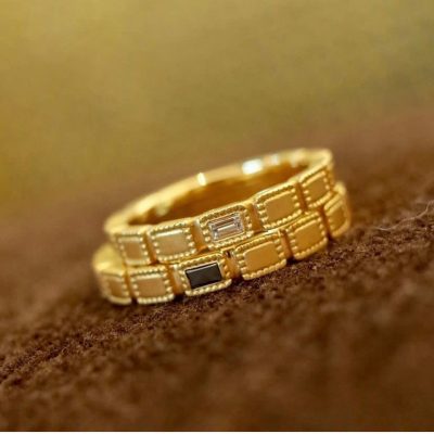 遊び心のあり、アンティークでおしゃれな印象です。 - アンティーク感漂うマット仕上げのゴールドがこなれた印象です。男性にもバゲットカットのブラックダイヤモンドをセッティングした個性的なデザインです。