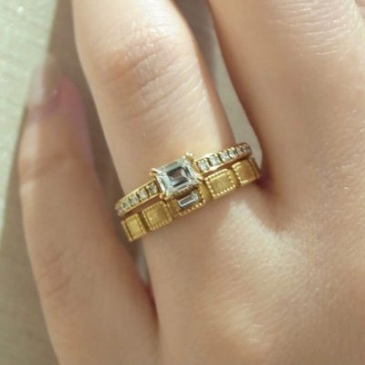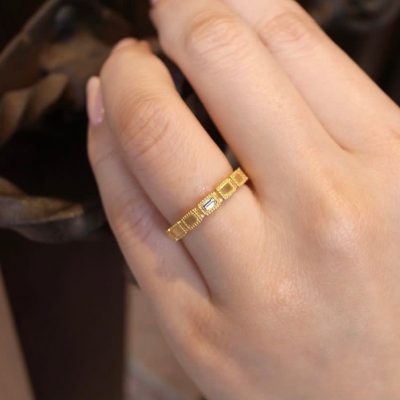 - マットゴールド×ミル打ち×バゲットカットダイヤのこだわりデザインの結婚指輪。