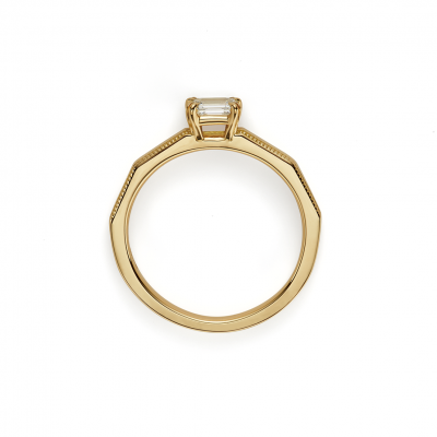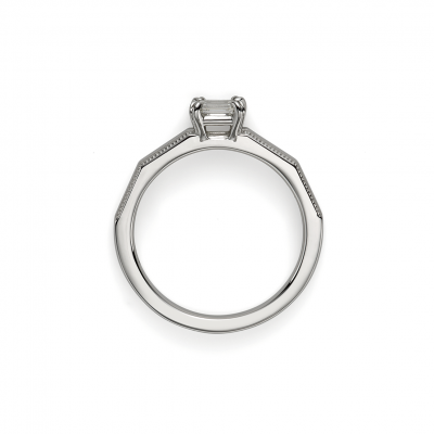 上下に施されたミルグレインがシャープなフォルムに柔らかさを演出し、エメラルドカットダイヤの輝きを引き立ててくれる婚約指輪です。