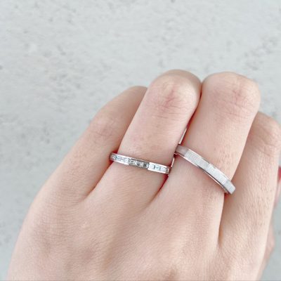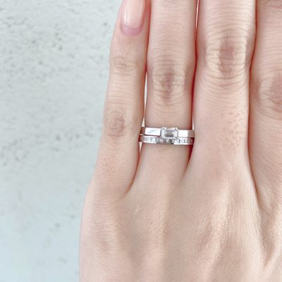 - エッジの効いたフォルムにバケットカットダイヤを横に並べたシンプルだけど存在感のあるエタニティータイプの結婚指輪